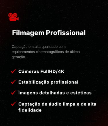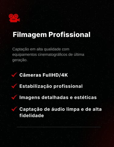 Produção de ponta a ponta: vídeos institucionais, comerciais, conteúdo para redes sociais e documentários com qualidade cinematográfica.